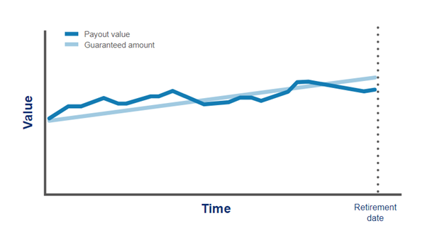 This graph is for illustrative purposes only and doesn't represent actual plan performance. It is only to give you an idea of how guarantees can work. We have assumed a single payment has been invested in a unitised with-profits plan and that smoothing is applied to the payout value over this period.