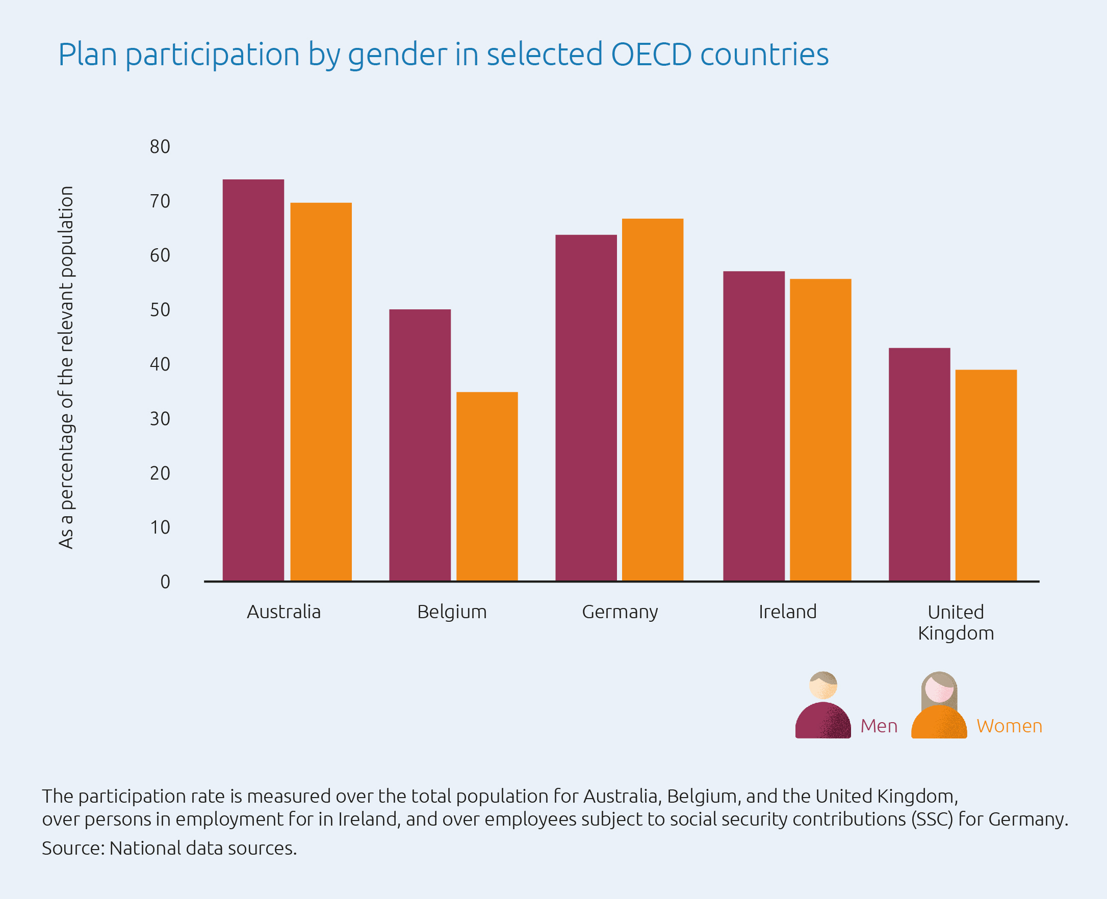 Within OECD countries as a whole, young workers tend to participate less in pension plans than other workers. For a selection of OECD countries – Australia, Belgium, Germany, Ireland and the United Kingdom – participation in pension plans peaks among middle-aged people and is lower for younger and older people.